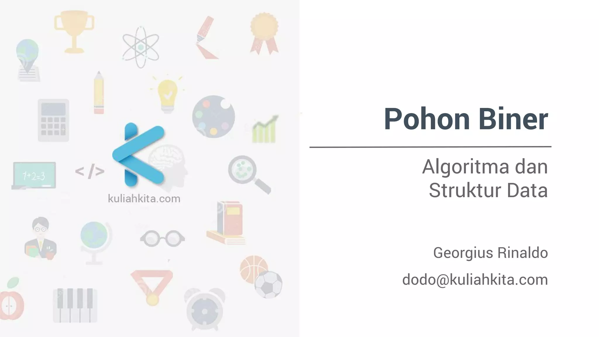 Dokumen ini menjelaskan tentang pohon biner sebagai struktur data dengan dua cabang maksimum (kiri dan kanan) per simpul dan mencakup cara deklarasi serta implementasi dalam C++. Selain itu, dokumen ini juga menyajikan contoh fungsi untuk mencari nilai dalam pohon biner secara rekursif.