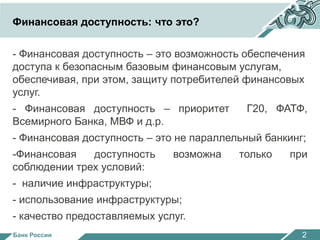 Документ обсуждает деятельность Банка России в области цифровых финансовых услуг, подчеркивая важность финансовой доступности и ее основные условия. Преимущества цифровых услуг включают высокую прозрачность и снижение издержек, тогда как вызовы касаются законодательных изменений и вопросов идентификации личности. Банк России активно работает над защитой прав потребителей и разработкой стандартов для операторов цифровых финансовых услуг.