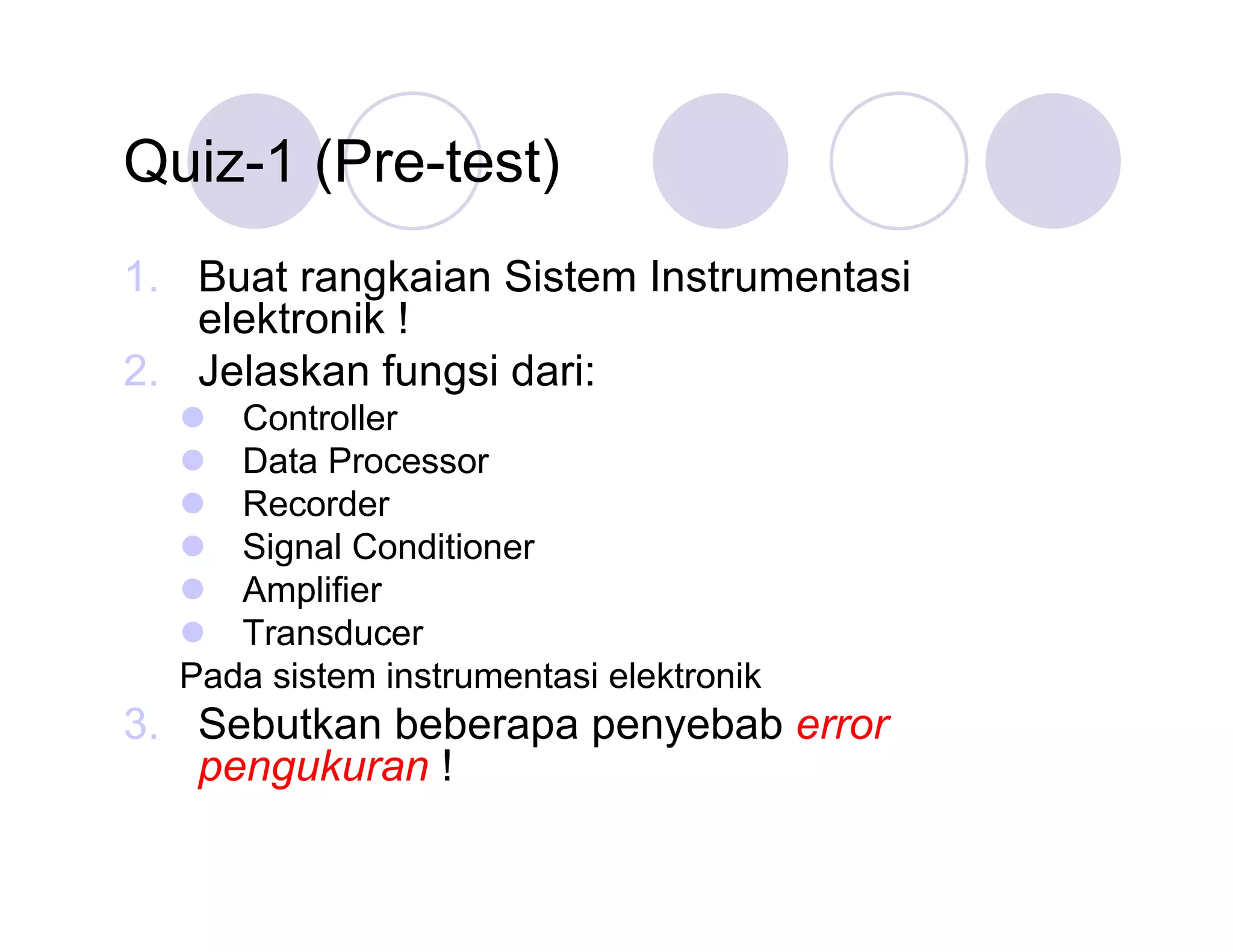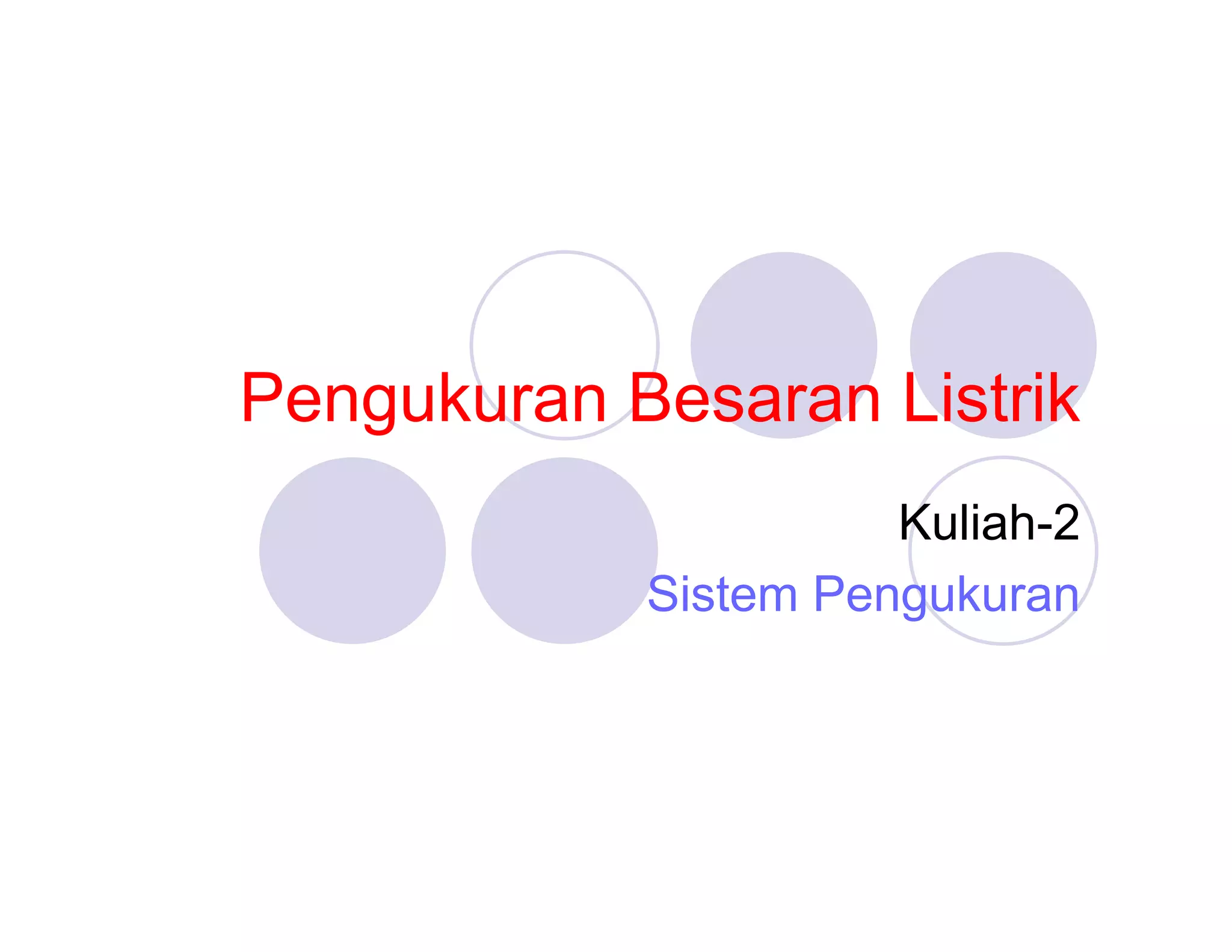 Sistem pengukuran listrik terdiri dari transducer, pengkondisi sinyal, penguat, perekam, dan pengolah data. Transducer mengubah besaran fisik menjadi sinyal listrik. Pengkondisi sinyal memanipulasi sinyal keluaran transducer. Penguat meningkatkan besar sinyal. Perekam menampilkan atau merekam sinyal. Pengolah data menganalisis hasil pengukuran untuk tujuan analisis. Kesalahan pengukuran dapat disebabkan
