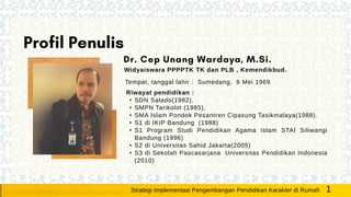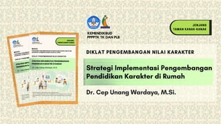 Dokumen tersebut merangkum strategi implementasi pengembangan pendidikan karakter di rumah melalui pembelajaran jarak jauh dan kegiatan sehari-hari. Strategi tersebut mencakup pengembangan karakter religius, mandiri, kreatif, kritis, komunikatif dan kolaboratif melalui kegiatan pembelajaran jarak jauh seperti storytelling dan kegiatan rutin di rumah seperti merencanakan jadwal harian.