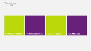 The document discusses test planning and outlines the key phases and activities in a test planning process. It emphasizes that an important part of planning is creating a test plan that is derived from an overall master test plan. The planning phase involves determining what will be tested based on business needs and risks, and managing the test process and different test types. It stresses the importance of coordination across test levels, phases, and types using a master test plan to avoid duplicative testing.