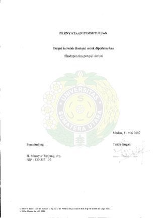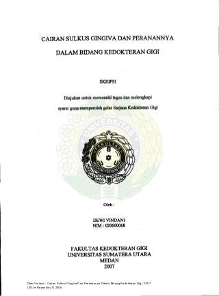 Dokumen ini membahas tentang cairan sulkus gingiva dan perannya dalam bidang kedokteran gigi. Cairan sulkus gingiva merupakan cairan yang terdapat di bawah gusi dan memiliki peran penting dalam memelihara kesehatan gigi dan gusi. Dokumen ini menjelaskan komposisi kimiawi cairan sulkus gingiva beserta fungsinya dalam mencegah infeksi dan menjaga homeostasis jaringan periodontal.
