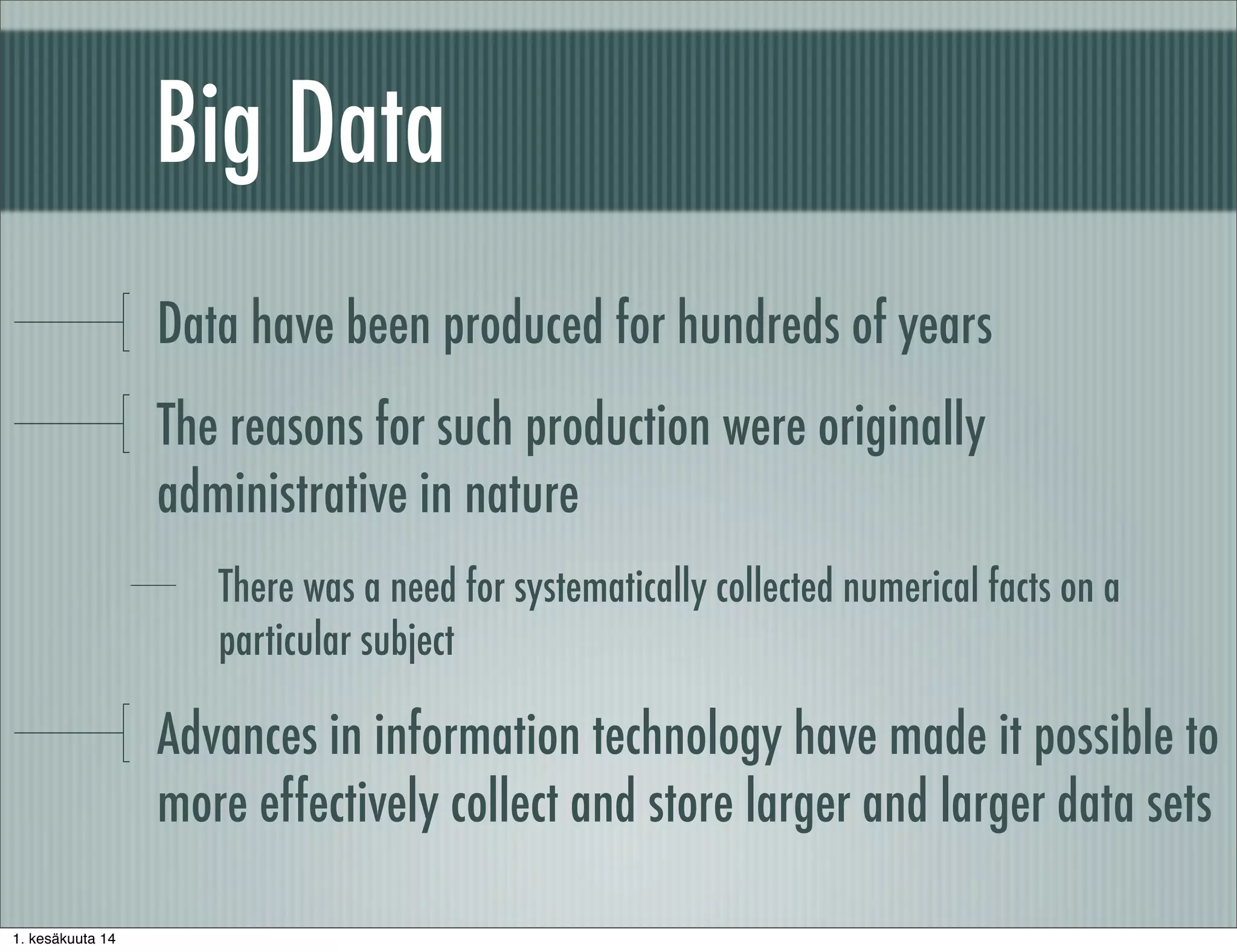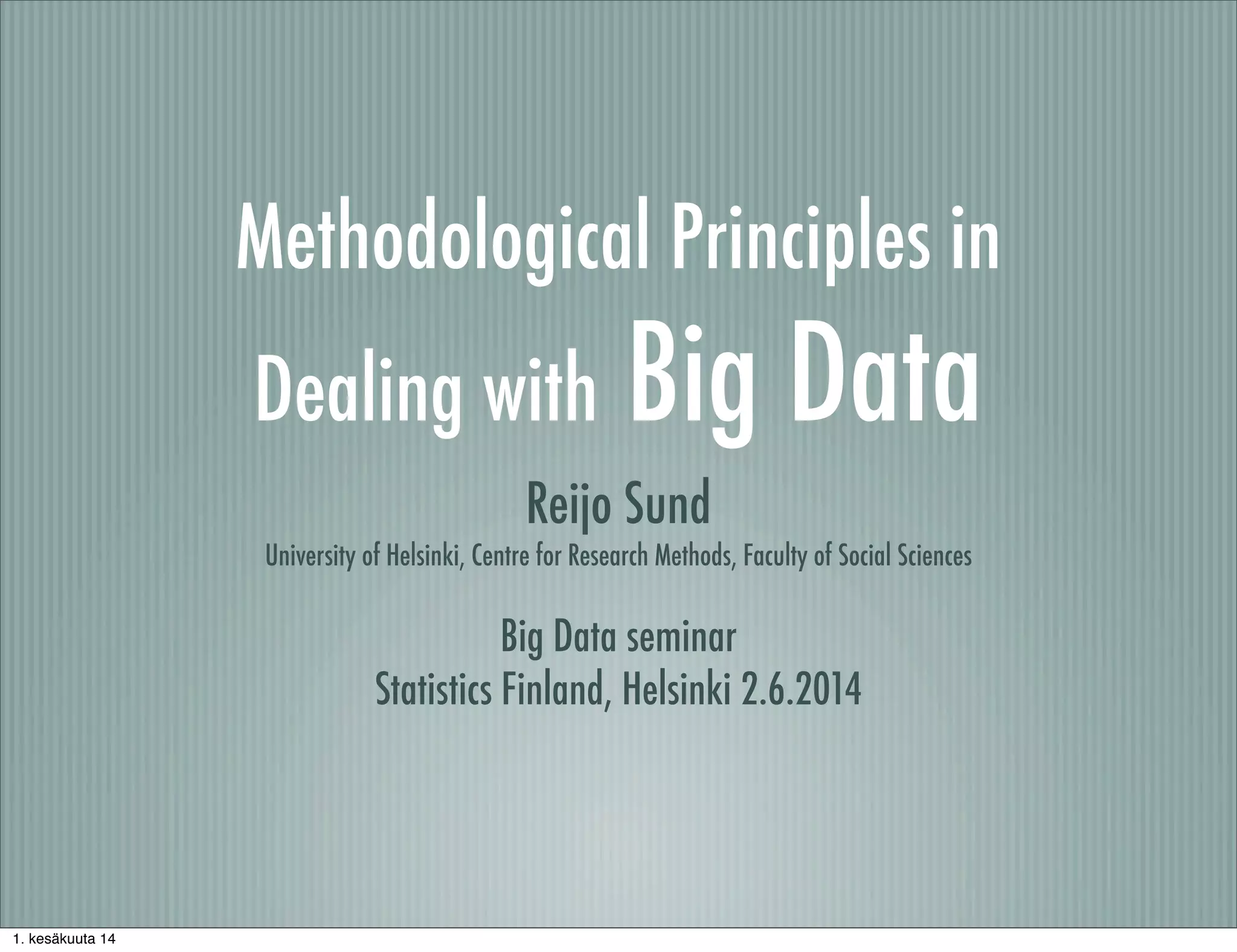 The document discusses methodological principles for working with big data. It notes that big data often consists of secondary data not tailored to specific research questions and requires additional background information and data preprocessing. Effective use of big data requires skills in measurement, data modeling, statistical computing, and the subject matter theory. Data preprocessing is an important part of the analysis process and involves correcting deficiencies, reducing uninteresting data, and intelligently enriching data with background knowledge.