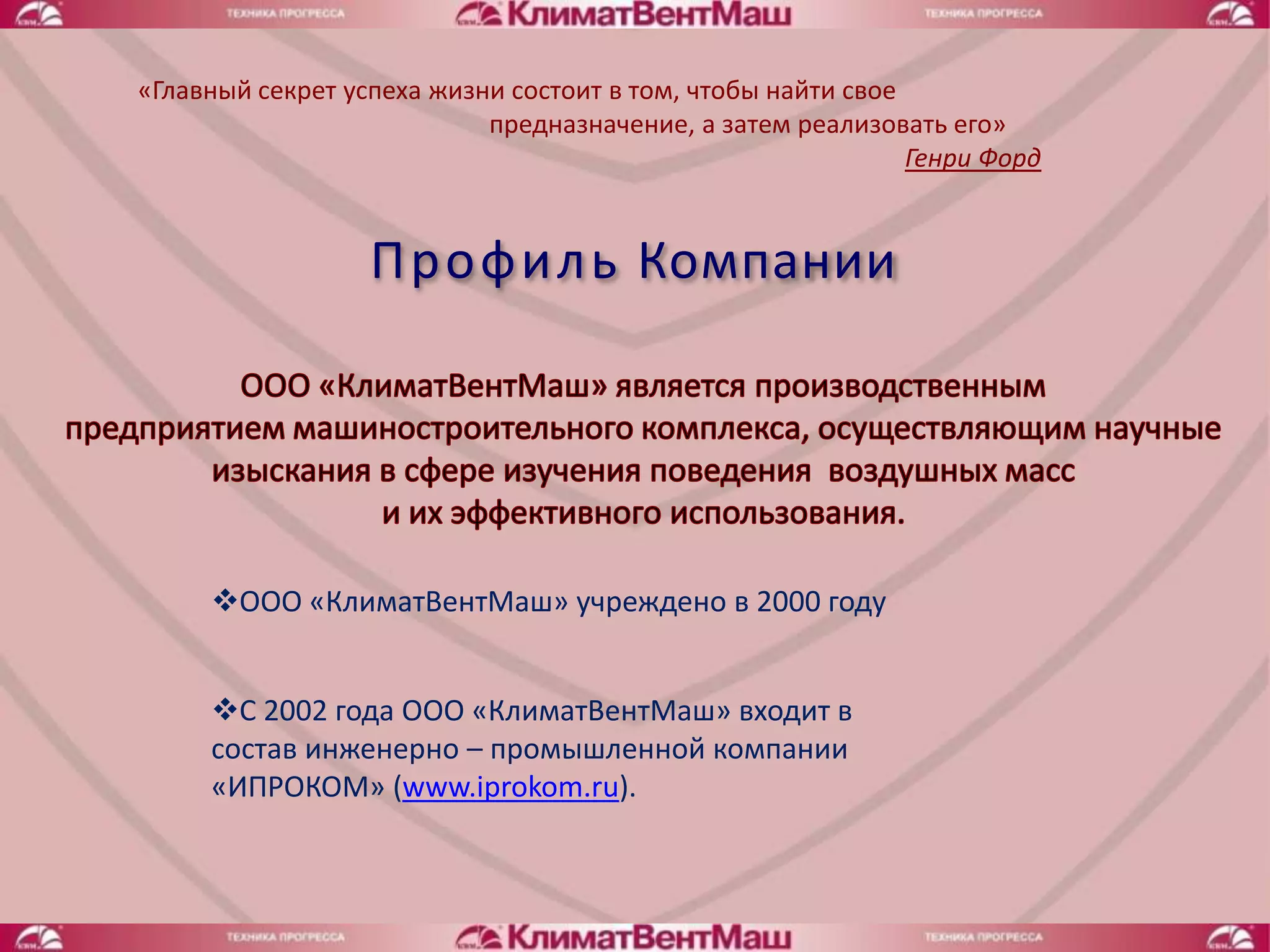 Компания 'Климатвентмаш', основанная в 2000 году, предлагает решения в области вентиляции и дымозащиты для различных объектов, включая жилые и коммерческие комплексы. Она ориентируется на улучшение качества продукции, развитие производственных мощностей и удовлетворение потребностей клиентов. В структуре компании имеются различные службы, такие как техническая, производственная и служба контроля качества, что способствует эффективному функционированию и постоянному совершенствованию.