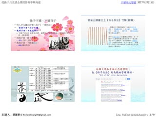 該文檔探討了《孫子兵法》在企業經營與中華商道中的應用,強調其重要的戰略和管理原則。文章分析了企業在領導、戰略、戰術、計劃和人才管理方面的最佳實踐,並提到如何利用情報及數據驅動決策以追求利潤和所有利益相關者的利益。最後,文檔提出了溝通協調的重要性,以促進組織內部的共同目標和價值觀。
