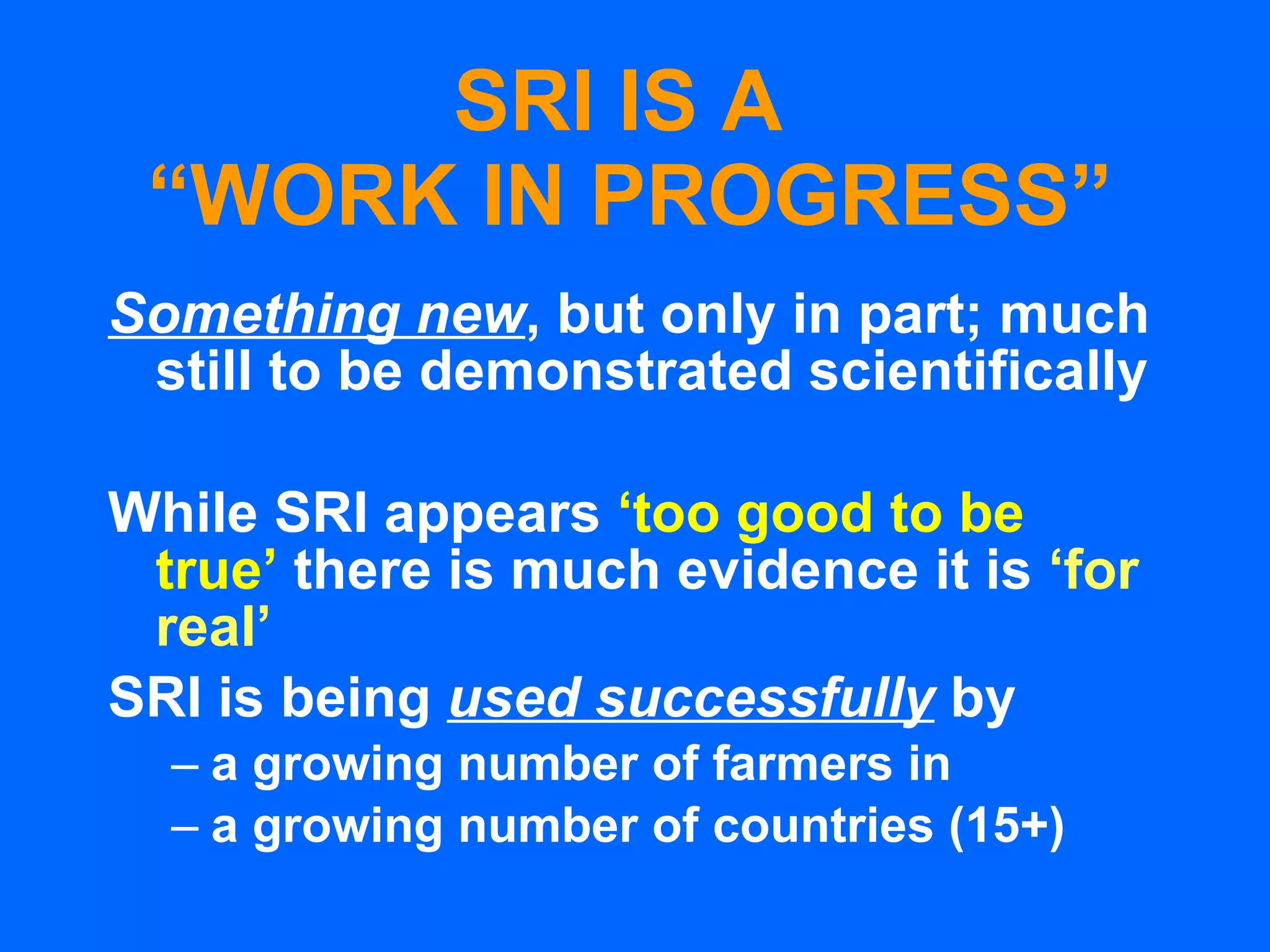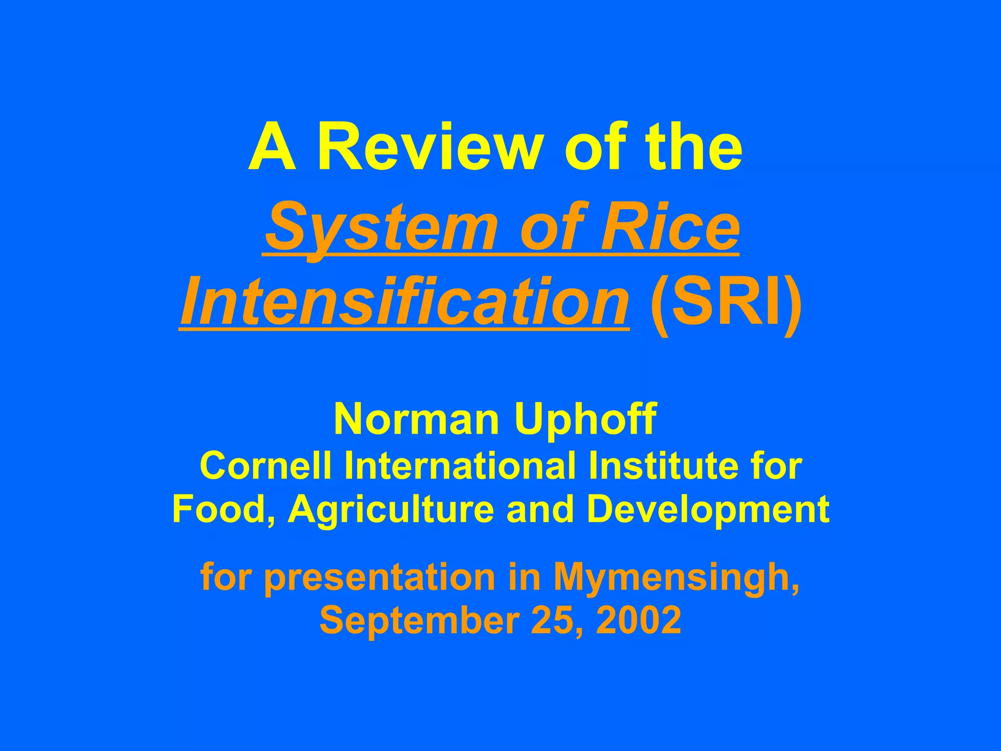 This document provides an overview of the System of Rice Intensification (SRI), which is a methodology for growing rice that can produce higher yields with fewer inputs. SRI involves transplanting young seedlings with wide spacing, maintaining moist soil rather than continuous flooding, and incorporating other practices. Key findings from SRI include larger and more extensive root systems, increased numbers of tillers per plant, and higher yields compared to conventional rice growing. While promising, SRI is still being studied scientifically to better understand the mechanisms producing its effects. The document discusses several potential explanations for SRI's results and calls for further research collaboration.
