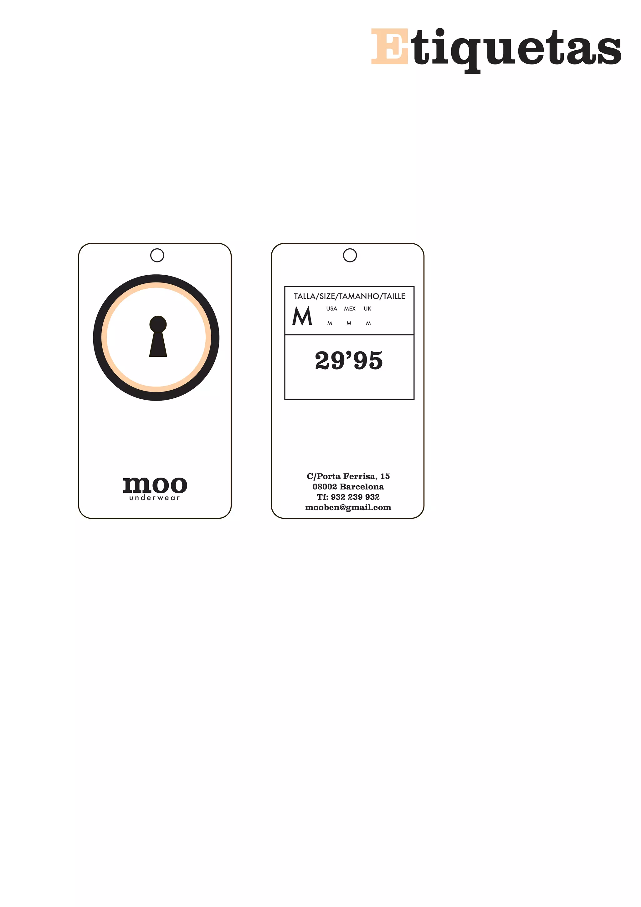 This document provides sizing information for clothing items. It lists common size designations for the United States, Mexico, United Kingdom, and European sizing. Additionally, it includes contact information for an underwear company located in Barcelona, Spain called moo, including their address, phone number, and email.