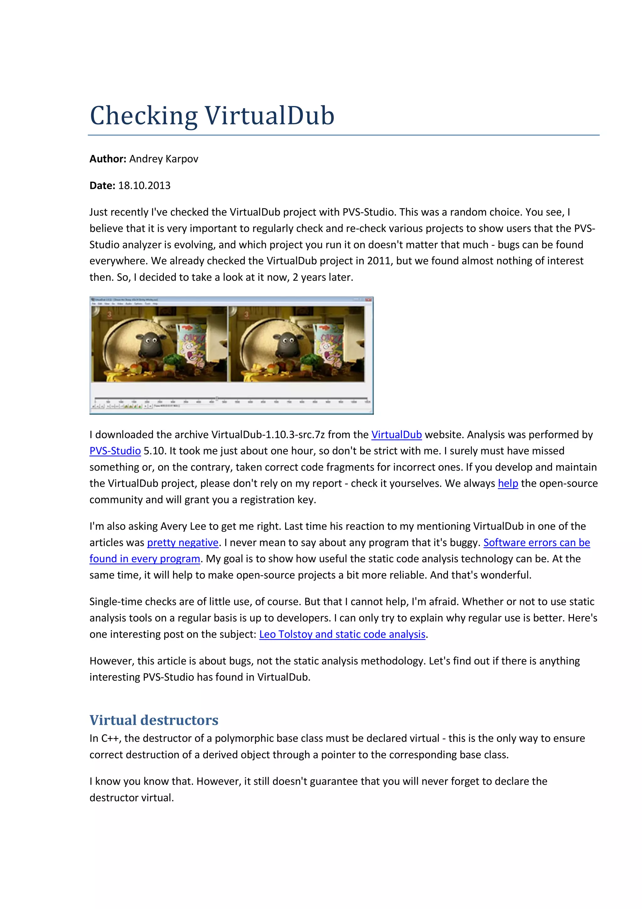The document discusses a static code analysis performed on the VirtualDub project using PVS-Studio to identify various code issues, including violations of best practices, undefined behaviors, and potential bugs. Key issues identified include missing virtual destructors in polymorphic classes, incorrect handling of pointers before null checks, and misuse of magic numbers in string operations. The author highlights the importance of regular code analysis for enhancing software reliability and encourages developers to verify findings independently.