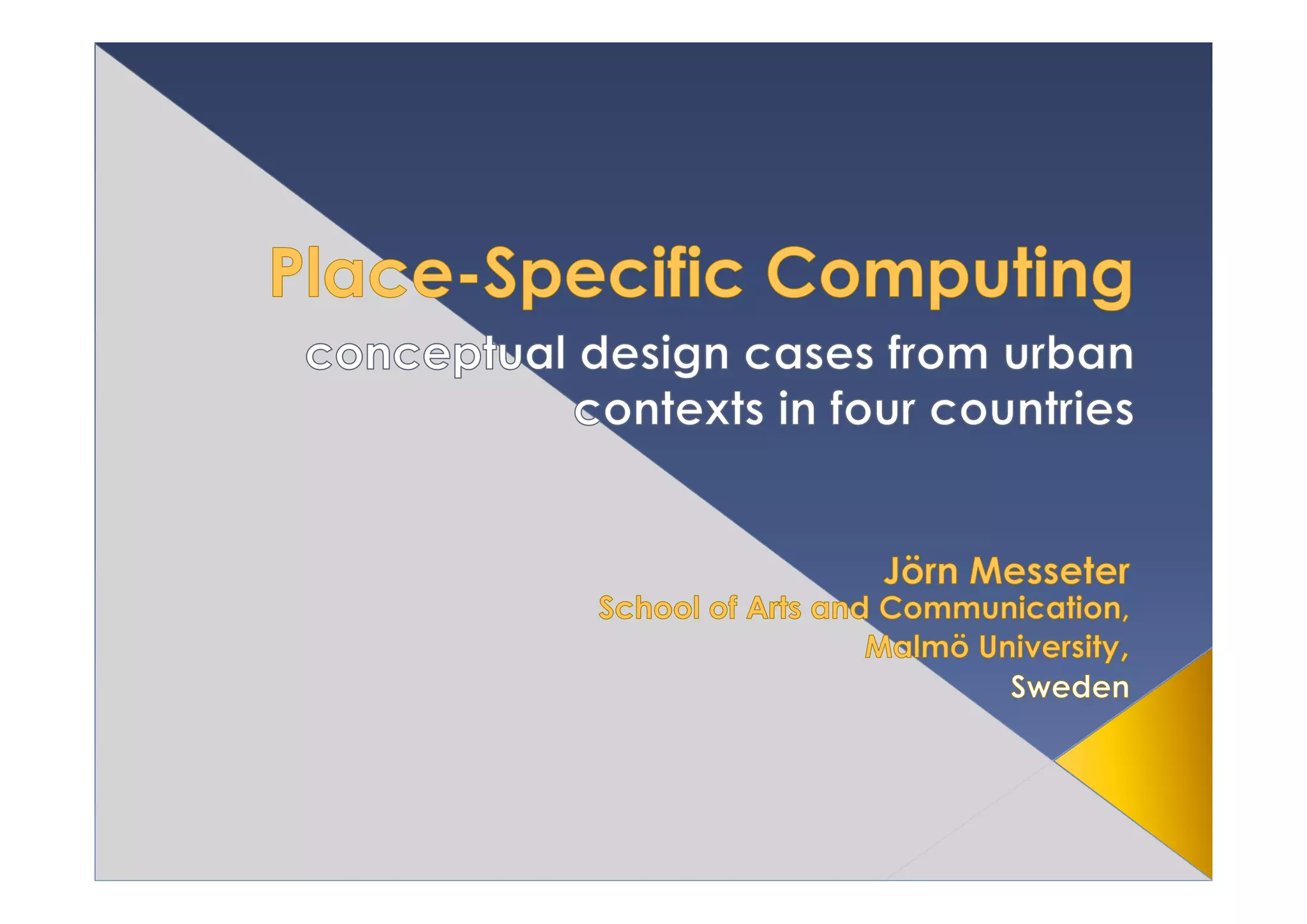 Place-specific computing is proposed as a new approach that focuses on shaping interactions mediated by digital artifacts situated within and tailored to particular physical locations. It aims to utilize place-specific resources to enhance users' experiences of those places. The document outlines this concept and discusses pilot studies in four countries that suggest it represents a new design genre focused on how context influences usability and can become the subject of interactions. It expresses an alternative to ubiquitous technology that is not grounded in particular places.