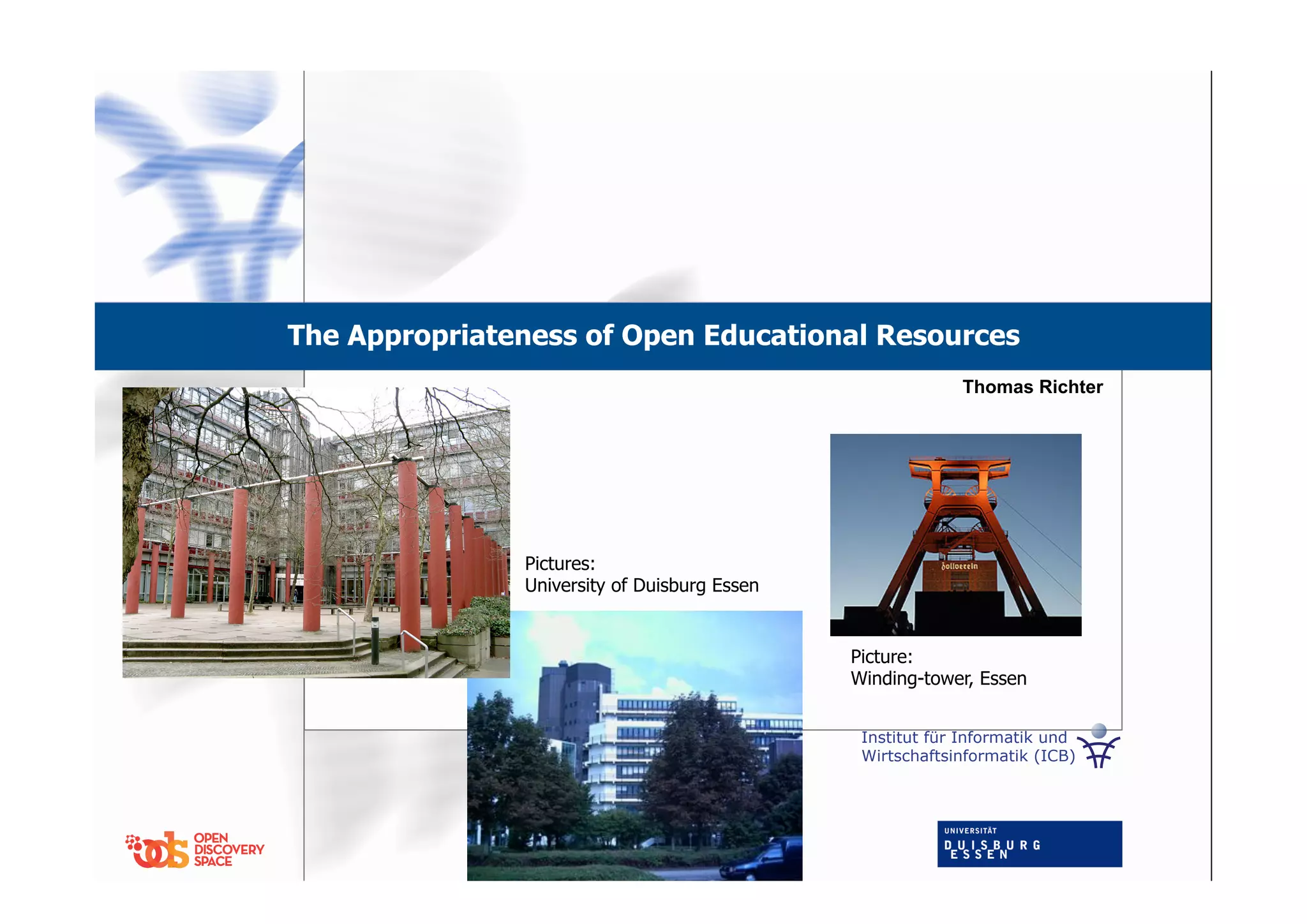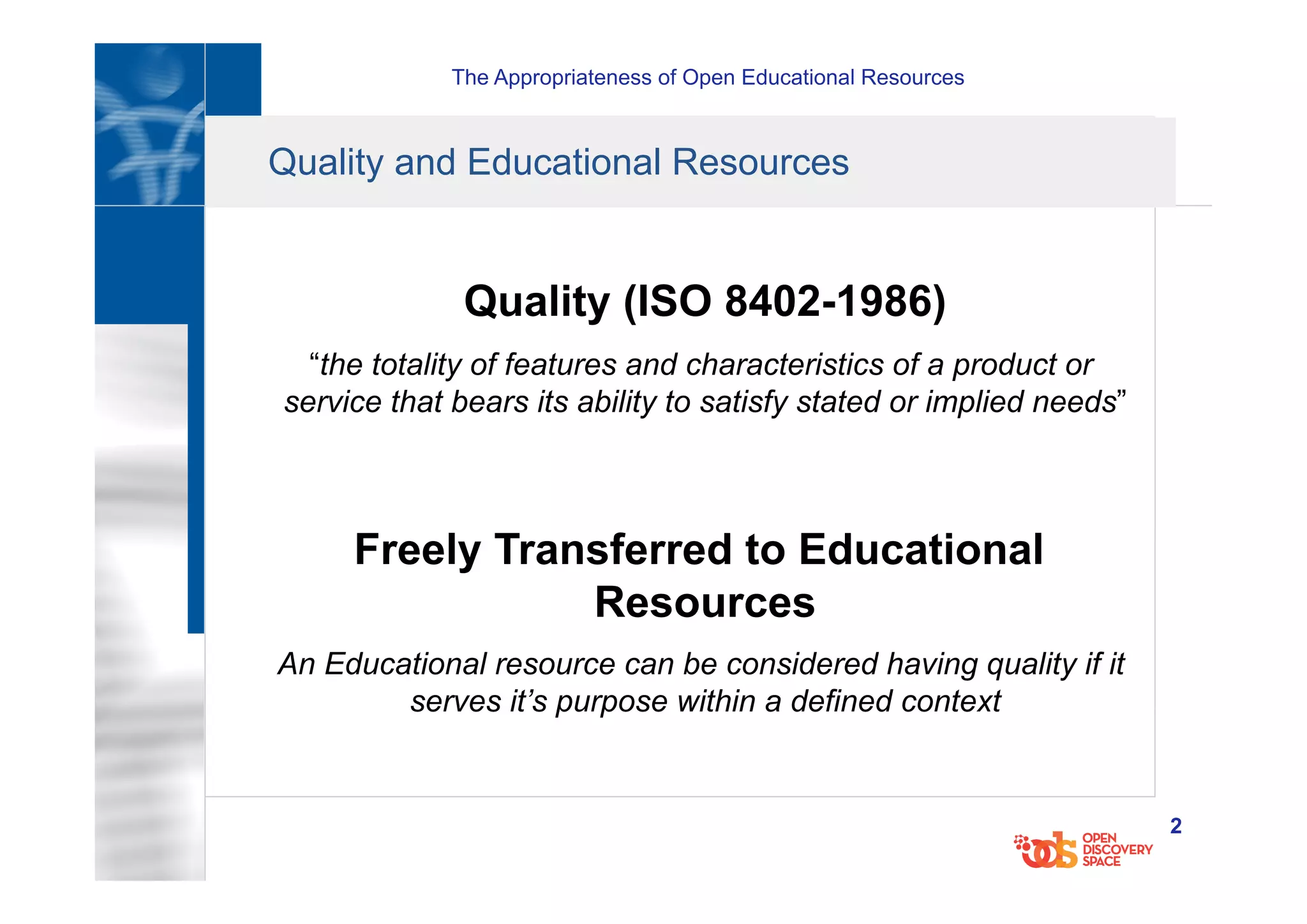 The document discusses the appropriateness and quality of open educational resources (OERs). It defines quality as a resource's ability to satisfy stated needs within a context. While professionally produced educational content targets a specific group, OERs are open to all, varying their target group and quality standards. The appropriateness of an OER depends on an individual's criteria like cultural factors, infrastructure, and how adaptable the resource is to their needs. For an OER to be truly open and useful to everyone, adaptability should be a key part of metadata quality standards.