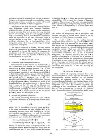 This document discusses algorithms for avoiding kinematic singularities in 6-DOF robotic manipulators controlled in real time using a teaching pendant. It proposes two algorithms: (1) non-redundancy avoidance using damped least squares to modify the inverse kinematic solution near singularities, and (2) redundancy avoidance using a potential function based on manipulability to incorporate singularity avoidance for redundant manipulators. The algorithms are experimentally tested on a DENSO VP-6242G robot to evaluate performance near shoulder and wrist singularities during teaching pendant controlled motion.