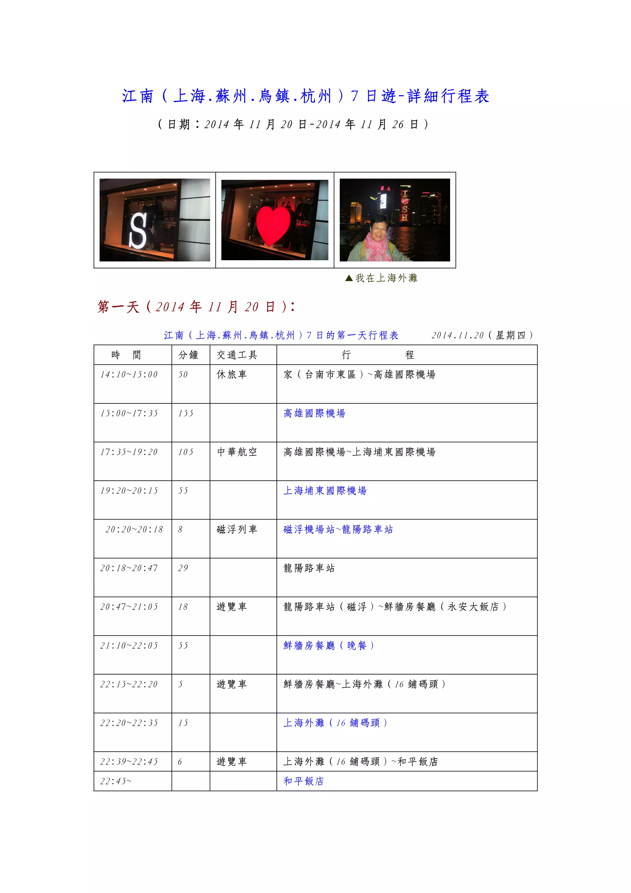 本行程包含了七天游览江南地区的主要城市:上海、苏州、乌镇和杭州。从2014年11月20日到11月26日,游客体验了多种交通方式和丰富的旅游活动,如参观著名景点、享用当地美食和自由活动。行程安排详细,覆盖了主要的旅游景点和文化体验。