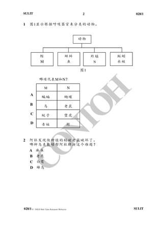该文档为马来西亚教育部发布的科学考试试卷,涵盖多种科学主题,包括动物、植物、呼吸系统、实验方法等。试卷包含40道选择题,要求学生选择正确答案并在答题纸上涂黑。内容旨在评估学生对科学知识的理解和应用能力。