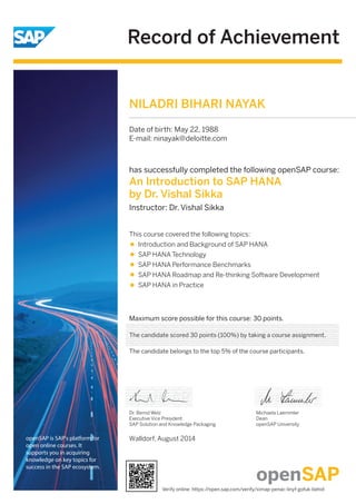 This document is a record of achievement certifying that Niladri Bihari Nayak successfully completed an open online course called "An Introduction to SAP HANA" offered through openSAP, SAP's platform for open courses, by scoring 30 out of a possible 30 points and ranking in the top 5% of participants.