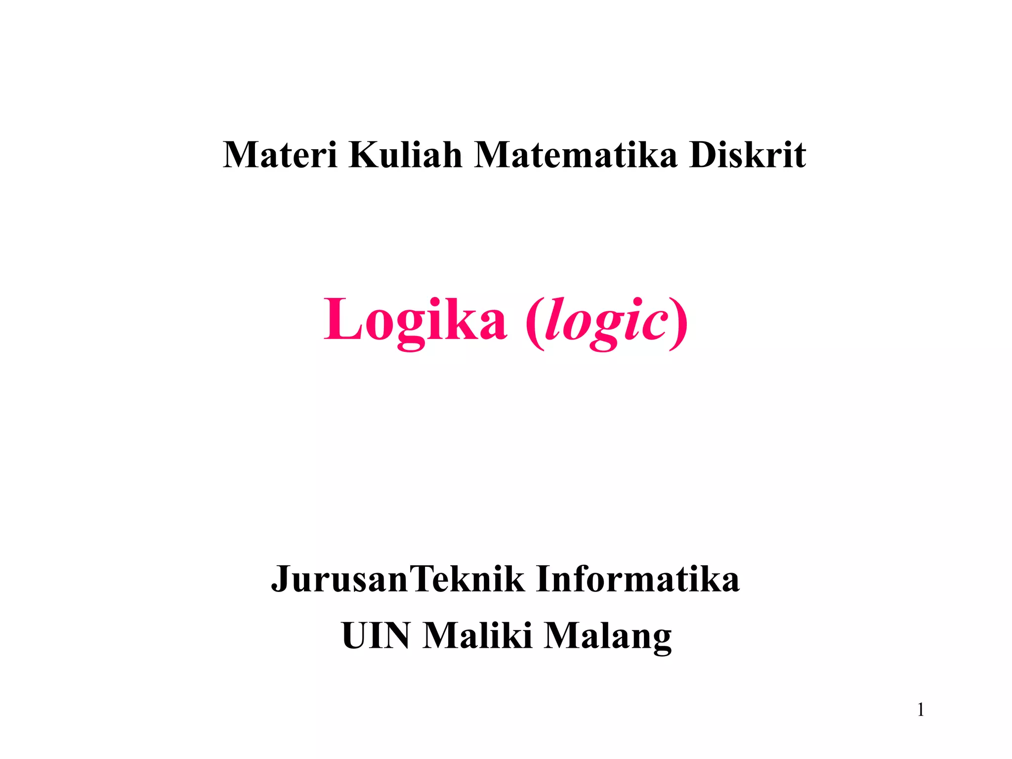 Dokumen tersebut membahas tentang materi kuliah logika matematika yang mencakup pengertian logika, proposisi, operator logika, tabel kebenaran, hukum-hukum logika, dan proposisi bersyarat. Secara khusus dibahas mengenai pendefinisian proposisi, penggunaan operator logika untuk mengkombinasikan proposisi, dan penggunaan tabel kebenaran untuk mengevaluasi nilai kebenaran proposisi majemuk.