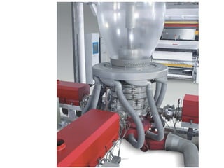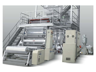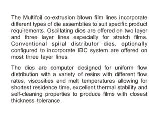 The document discusses multi-layer composite films and the extrusion process used to produce them. It describes how multiple polymer layers from different extruders can be combined into a single film through a multi-manifold die. The film is then cooled on chill rollers before undergoing slitting, gauging, and winding into rolls. Properties like optical clarity and barrier performance can be optimized through adjustments to materials, temperatures, and processing speeds. Common polymers used include polyolefins like polyethylene and polypropylene.