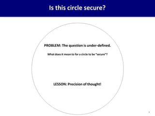 This document provides an overview of computer security concepts. It defines information security using the CIA triad of confidentiality, integrity and availability. It describes the computer security model involving assets, vulnerabilities, threats and countermeasures. It discusses classes of threats and examples of each. Design principles for secure software engineering are outlined, including least privilege and complete mediation. The importance of threat modeling and the security strategy of specification, implementation and evaluation are emphasized. The goal is to promote systematic thinking to reduce vulnerabilities and the likelihood of missed threats.