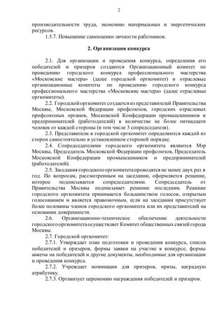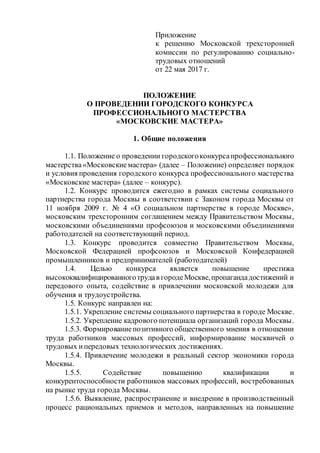 Документ описывает положение о проведении городского конкурса профессионального мастерства «Московские мастера», цель которого — повысить престиж высококвалифицированного труда в Москве и привлечь молодежь к рабочим профессиям. Конкурс организован правительством Москвы совместно с профсоюзами и работодателями, проводится ежегодно и включает предварительный и финальный этапы. Награждение победителей осуществляется в рамках городских праздников, а финансирование конкурса происходит из бюджета города и спонсорских средств.