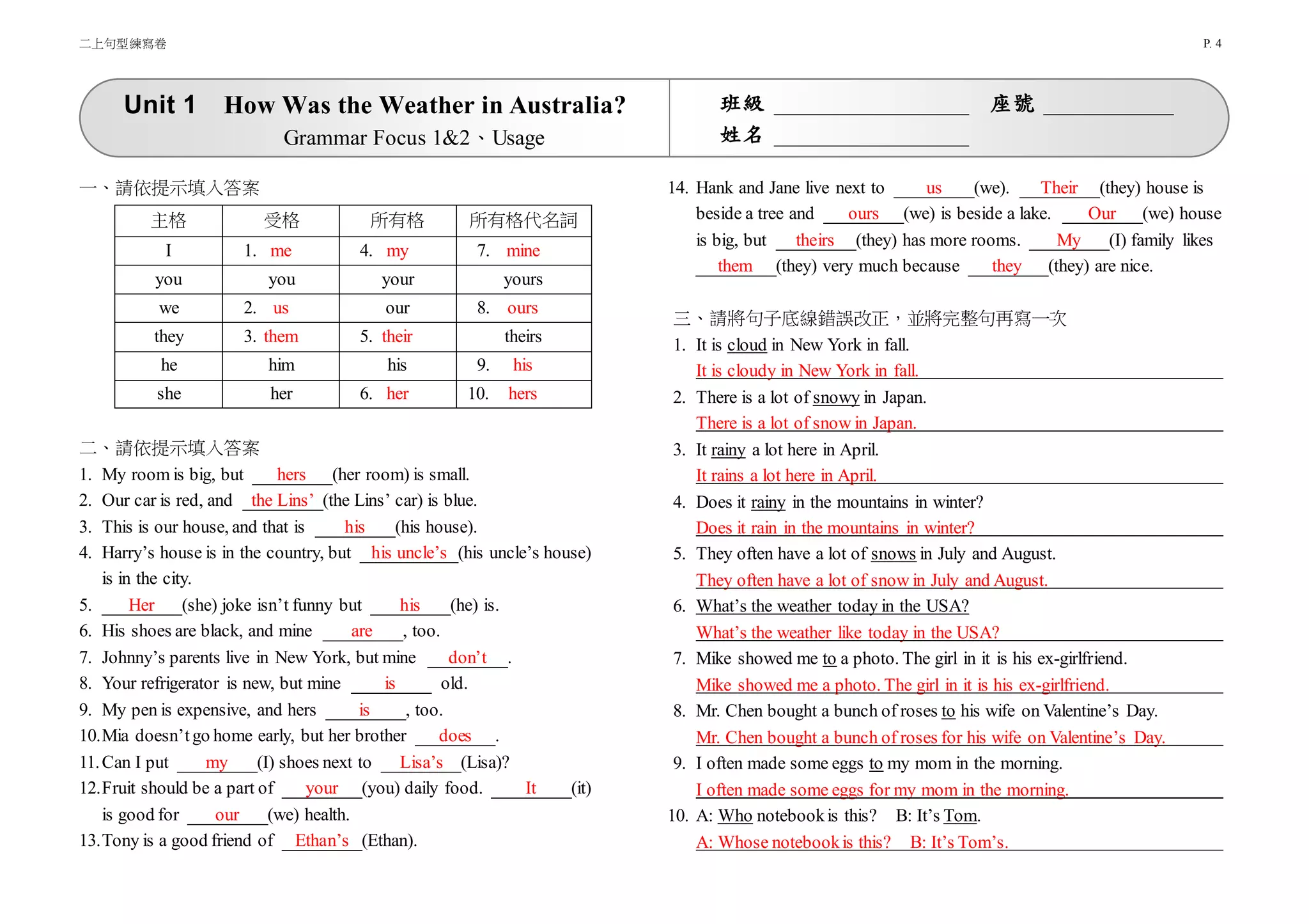 1. The document is an English grammar exercise focusing on pronouns and possession.