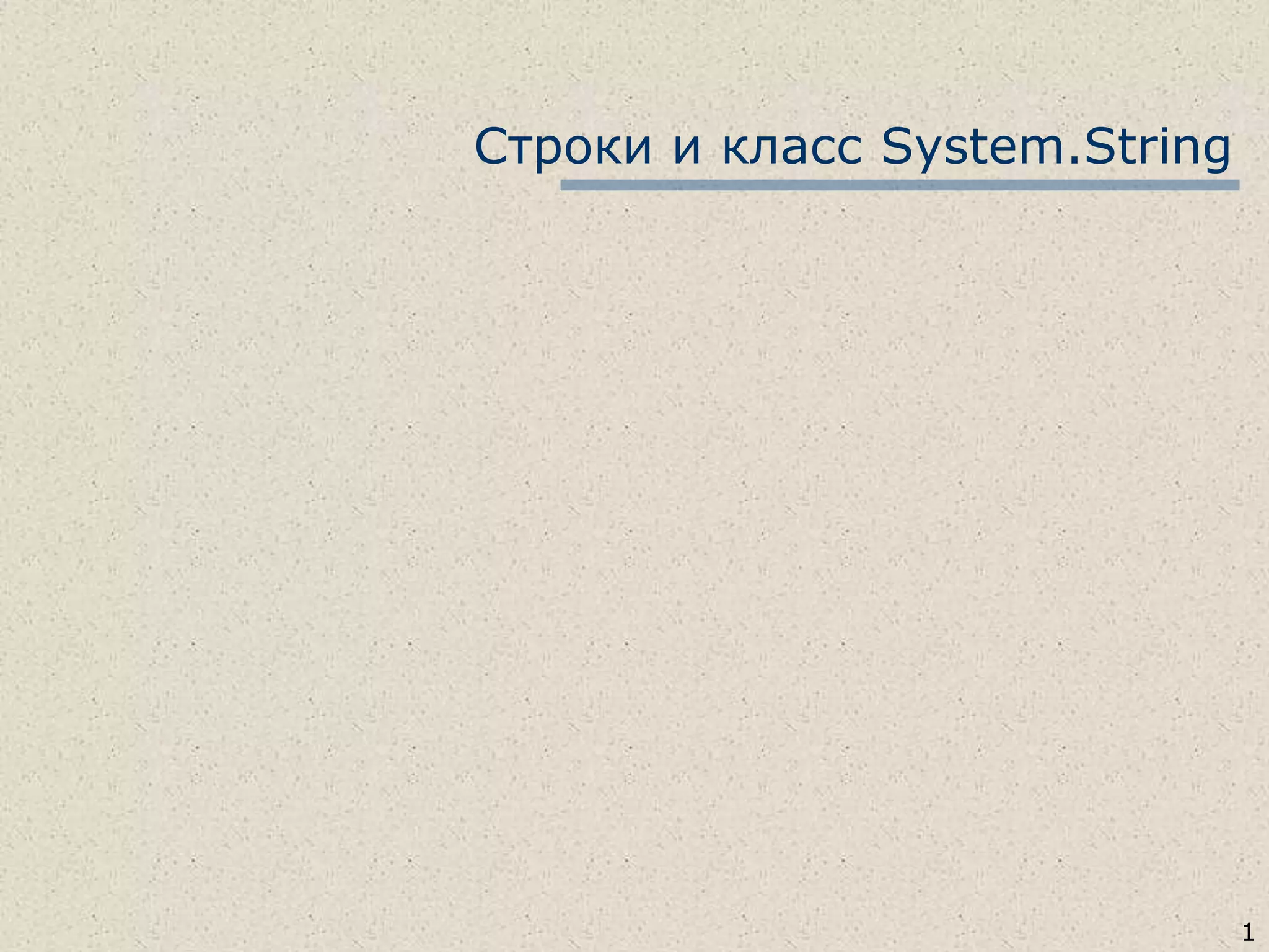 Документ описывает строки и класс system.string в языке программирования, акцентируя внимание на их свойствах, методах и операциях. Рассматриваются такие важные аспекты, как неизменяемость строк, конкатенация, сравнение, манипуляции с подстроками и форматированием, а также использование класса StringBuilder для оптимизации работы с динамически изменяемыми строками. Также приведены примеры использования методов и спецификаторов формата для строк и чисел.