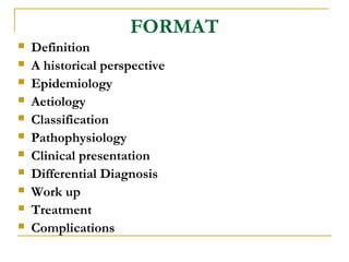 This document defines appendicitis and provides details about its historical perspective, epidemiology, etiology, classification, pathophysiology, clinical presentation, differential diagnosis, workup, treatment, and complications. Specifically, it notes that appendicitis is inflammation of the vermiform appendix and was first described in 1886. It occurs most commonly in the second and third decades of life and has a higher incidence in males. Obstruction of the appendix is a major cause and results in increased intraluminal pressure and bacterial overgrowth. Clinical presentation involves shifting pain from the periumbilical region to the right lower quadrant. Treatment is an appendectomy, which can be open or laparoscopic. Complications include appendiceal