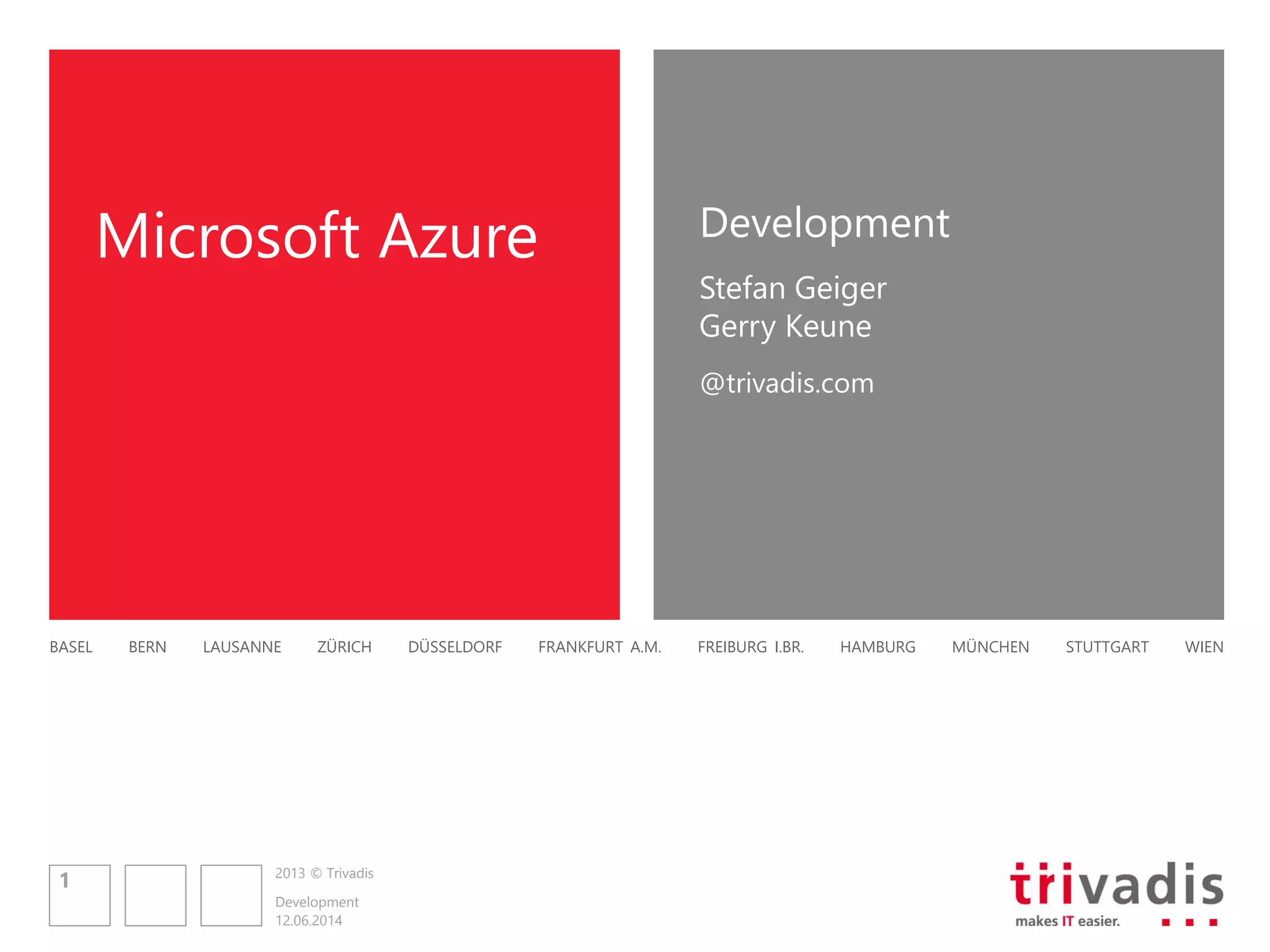 The document outlines the capabilities and benefits of Microsoft Azure services, including website hosting, cloud computing, and mobile services. It details features like easy deployment of applications, scalable web hosting, and extensive support for various development frameworks and languages. The content emphasizes Azure's ability to streamline development tasks and provides tools for managing backend services, authentication, and push notifications for mobile applications.