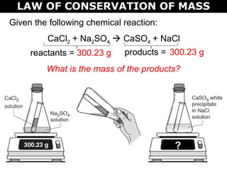 The document discusses the law of conservation of mass and balancing chemical equations. It explains that in a chemical reaction, while the types of atoms may change, the total mass remains the same. It then provides examples of balancing different chemical equations by making the numbers of atoms equal on both sides of the reaction arrow. Methods for balancing include multiplying coefficients and accounting for polyatomic ions.