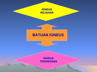 Dokumen ini membincangkan pelbagai jenis batuan termasuk batuan igneus, enapan, dan metamorfosis, serta ciri fizikal dan kawasan asalnya. Ia memberikan contoh spesifik untuk setiap jenis batuan bersama komposisi, tekstur, dan bentuk muka bumi yang berkaitan. Lokasi seperti Semenanjung Malaysia, Sabah, dan Amerika Syarikat juga disebut sebagai kawasan yang mempunyai batuan tertentu.