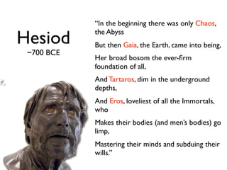 This document provides an overview of the history of ideas about evolution and natural history from ancient Greece through the early 19th century. Key figures discussed include Thales, Anaximander, Empedocles, Parmenides, Democritus, Epicurus, Plato, Aristotle, Descartes, Buffon, Lamarck, Cuvier, Geoffroy Saint-Hilaire, Erasmus Darwin, and Robert Grant. Their ideas ranged from essentialism and fixism to early proposals of transmutation of species and gradual evolution over long periods of time in response to environmental factors.