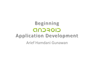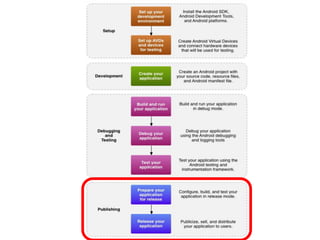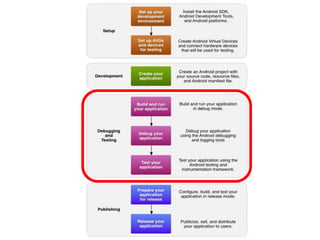 The document provides instructions on creating a "Hello World" Android application using Eclipse. It describes installing the Android SDK and ADT plugin, creating an Android Virtual Device (AVD), and generating a new Android project in Eclipse. The key steps are to install at least one Android platform, create an AVD specifying a target platform, and generate a new project specifying an application name, package, and activity class.