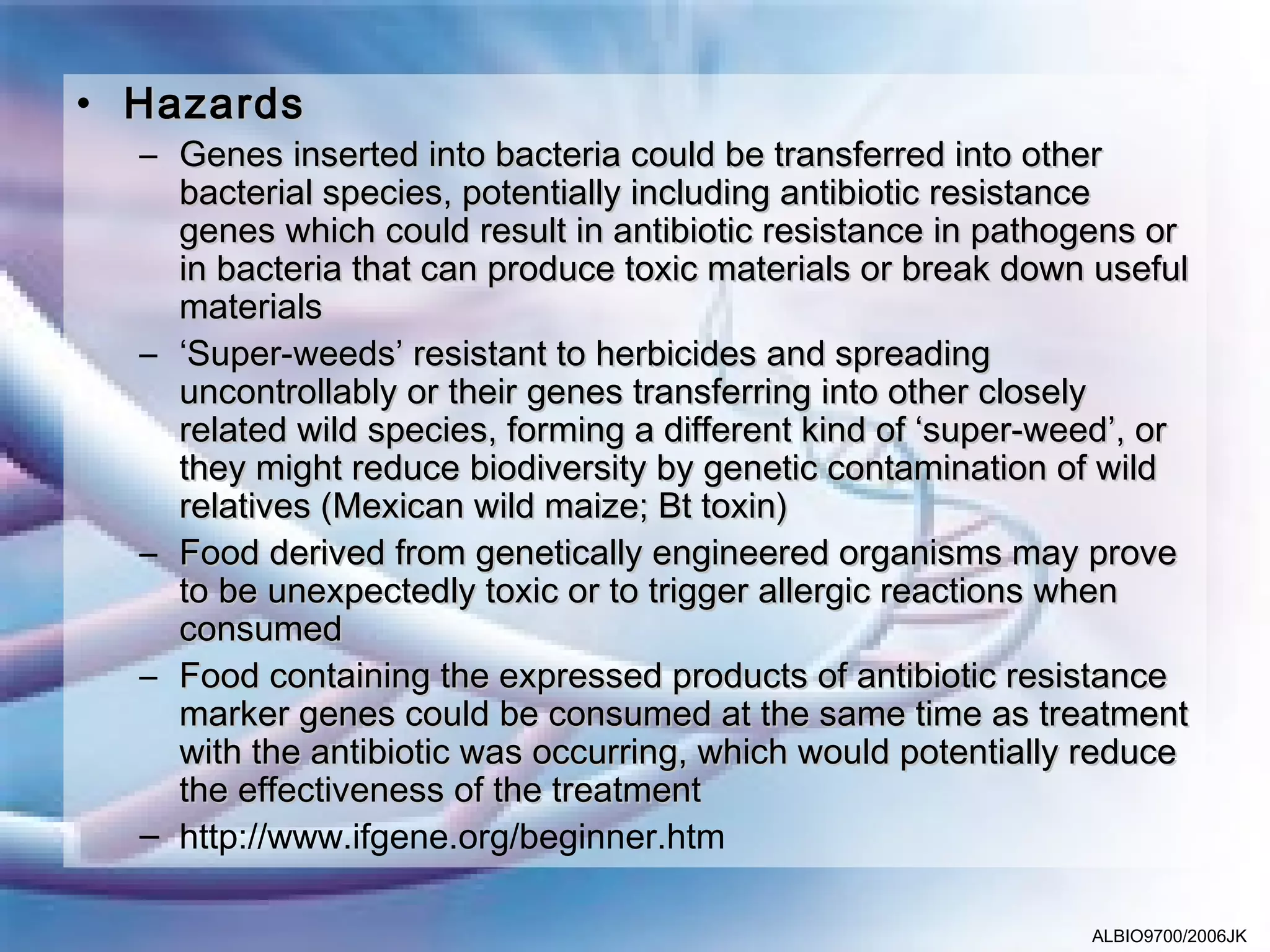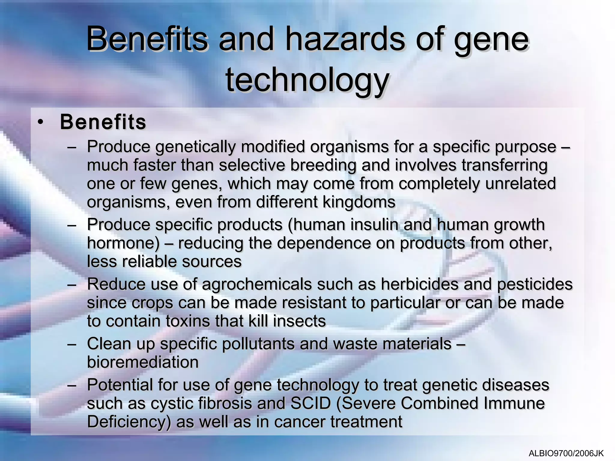Gene technology provides benefits such as producing genetically modified organisms faster than traditional breeding methods, creating organisms that produce specific products like human insulin, and developing crops with increased pest and herbicide resistance. However, there are also potential hazards such as the unintended transfer of genes between organisms which could lead to antibiotic resistance in pathogens, the creation of "superweeds", and food allergies from consuming genetically engineered products. The social and ethical implications involve both improving human welfare through increased food production and medical advances, but also risks of reduced biodiversity and ecosystem damage if genes spread in unintended ways.