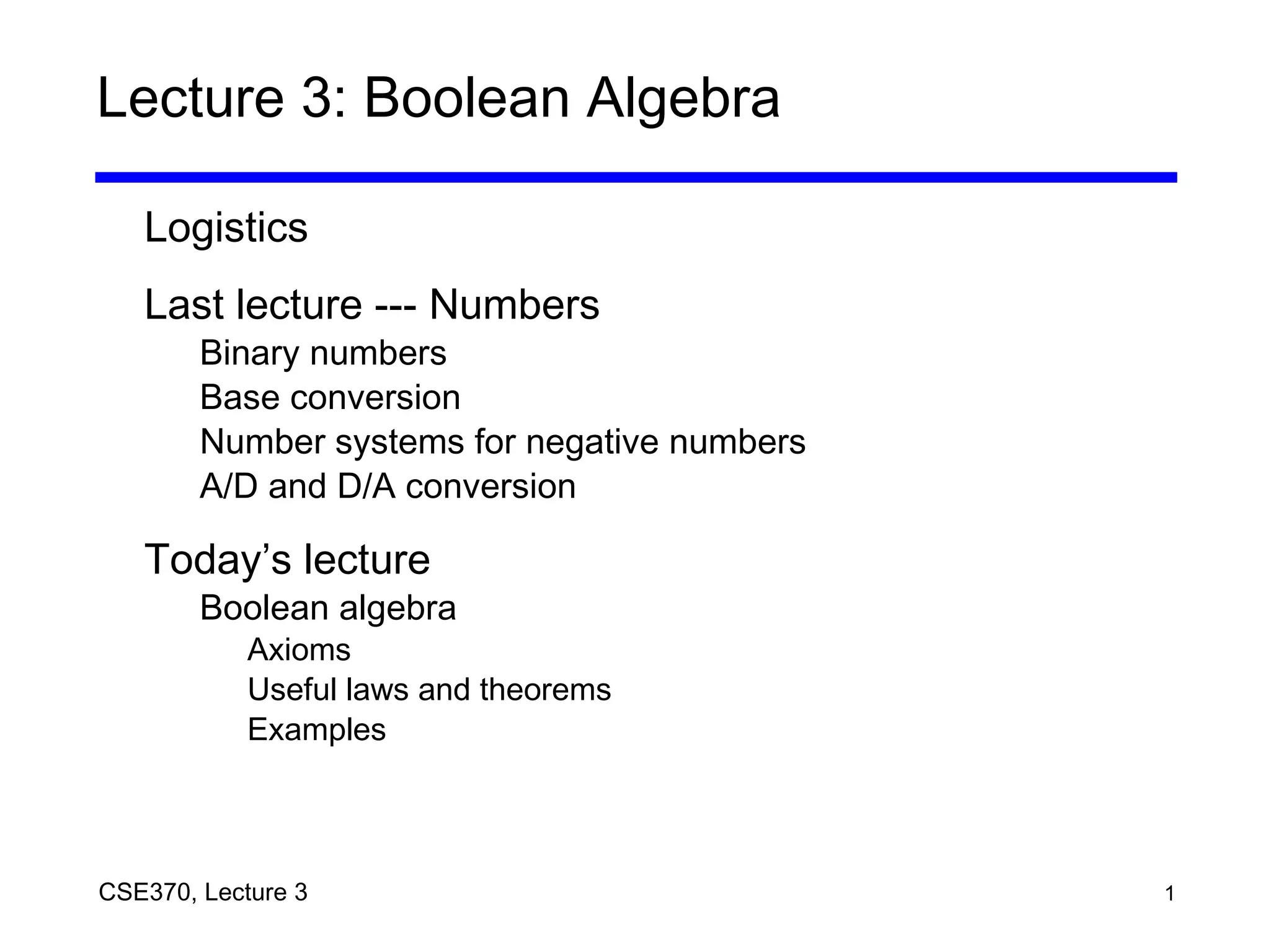 The document summarizes key topics from Lecture 3 of CSE370 including: