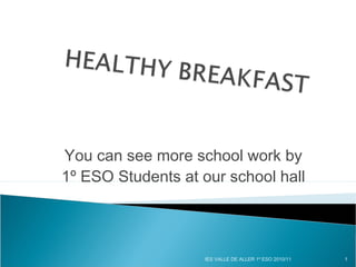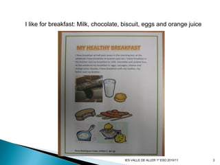 The document lists the school work of 12 students from 1o ESO at IES Valle de Aller for the 2010/11 school year. It includes a statement from the first student about their breakfast preferences of milk, chocolate, biscuit, eggs, and orange juice. The remaining 11 students' work from the school hall can be seen.