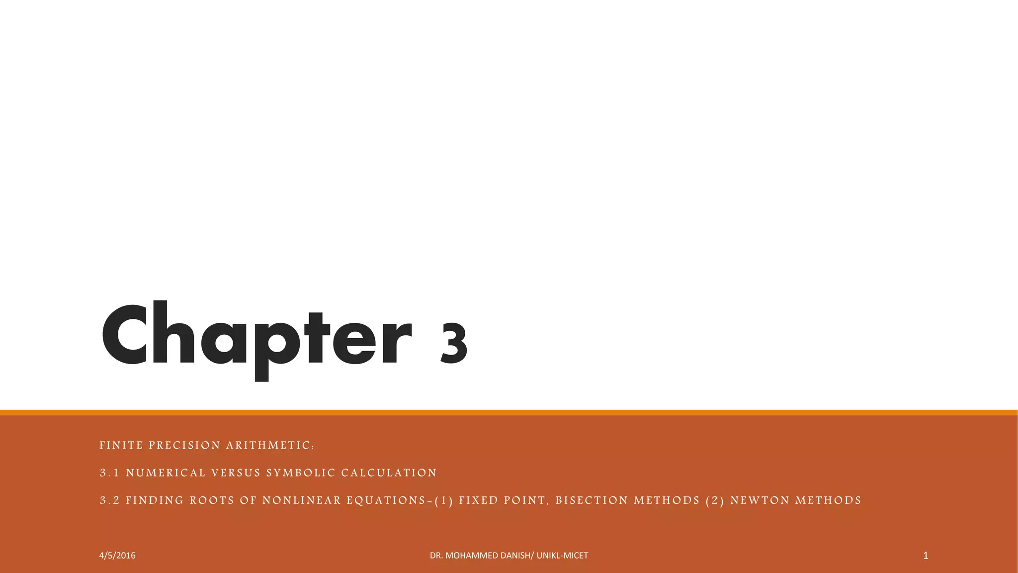This document discusses numerical methods for finding roots of nonlinear equations. It introduces symbolic calculations in MATLAB using the Symbolic Math Toolbox. Bisection and Newton's methods for finding roots are explained. MATLAB code examples are provided to implement these root-finding algorithms for sample equations. The document also describes using MATLAB's fzero function to numerically find roots.