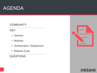 This document provides an overview and update on the Ceph community and development. It discusses the recent Hammer release, ongoing development work on CephFS and librados, upcoming Ceph Days and hackathons, metrics on community growth, and governance initiatives like the User Committee. It also covers deployment tools, the release cycle, and thanks attendees.