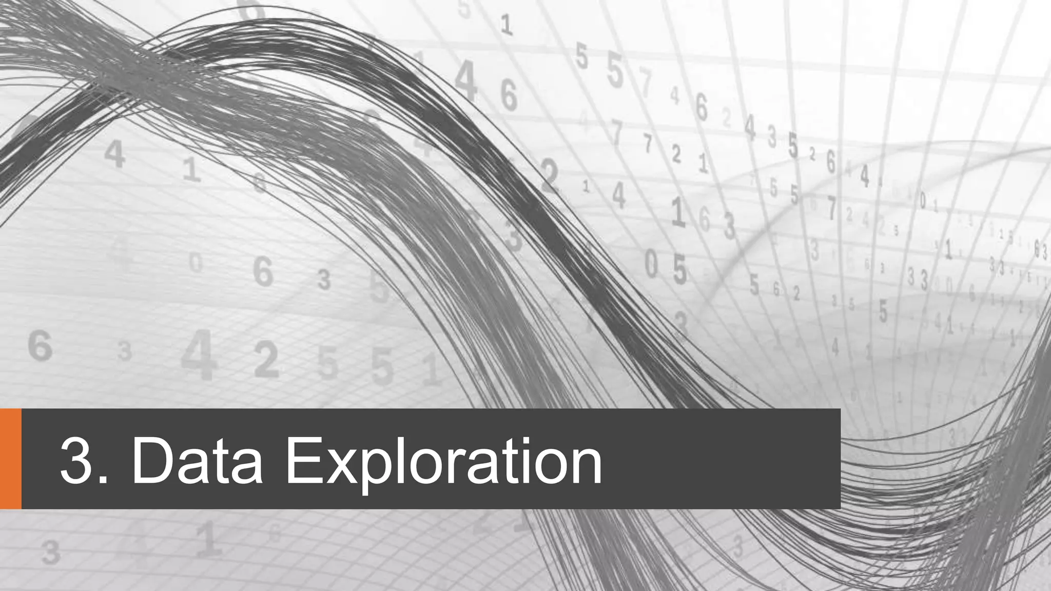 This document discusses objectives and techniques for data exploration, including understanding data, preparation for data mining, and interpreting results. It outlines univariate and multivariate descriptive statistics, various data visualization techniques like histograms and scatter plots, and provides a roadmap for exploring a data set through organizing, finding central points, understanding attribute spreads, visualizing distributions, pivoting data, identifying outliers, understanding relationships between attributes, visualizing those relationships, and visualizing high-dimensional data sets.
