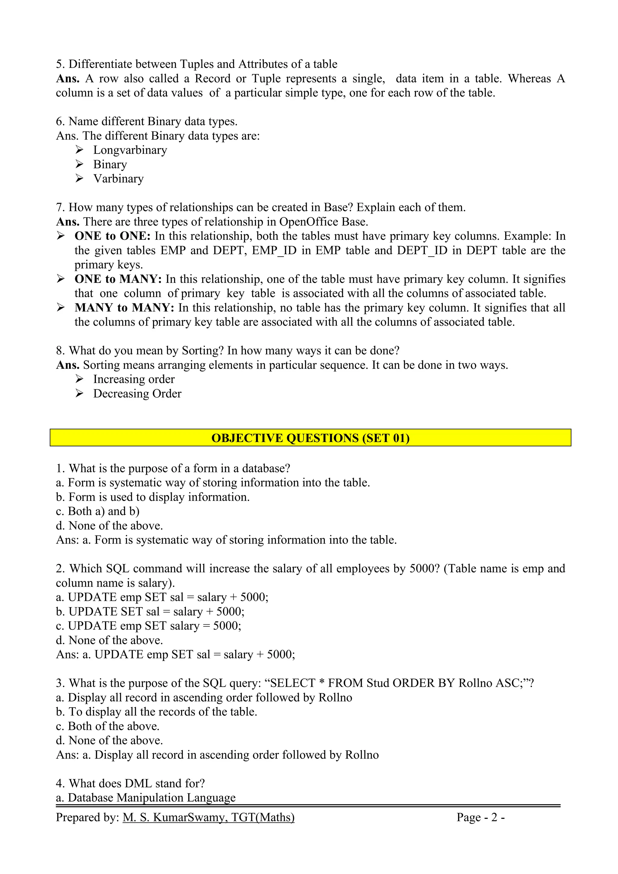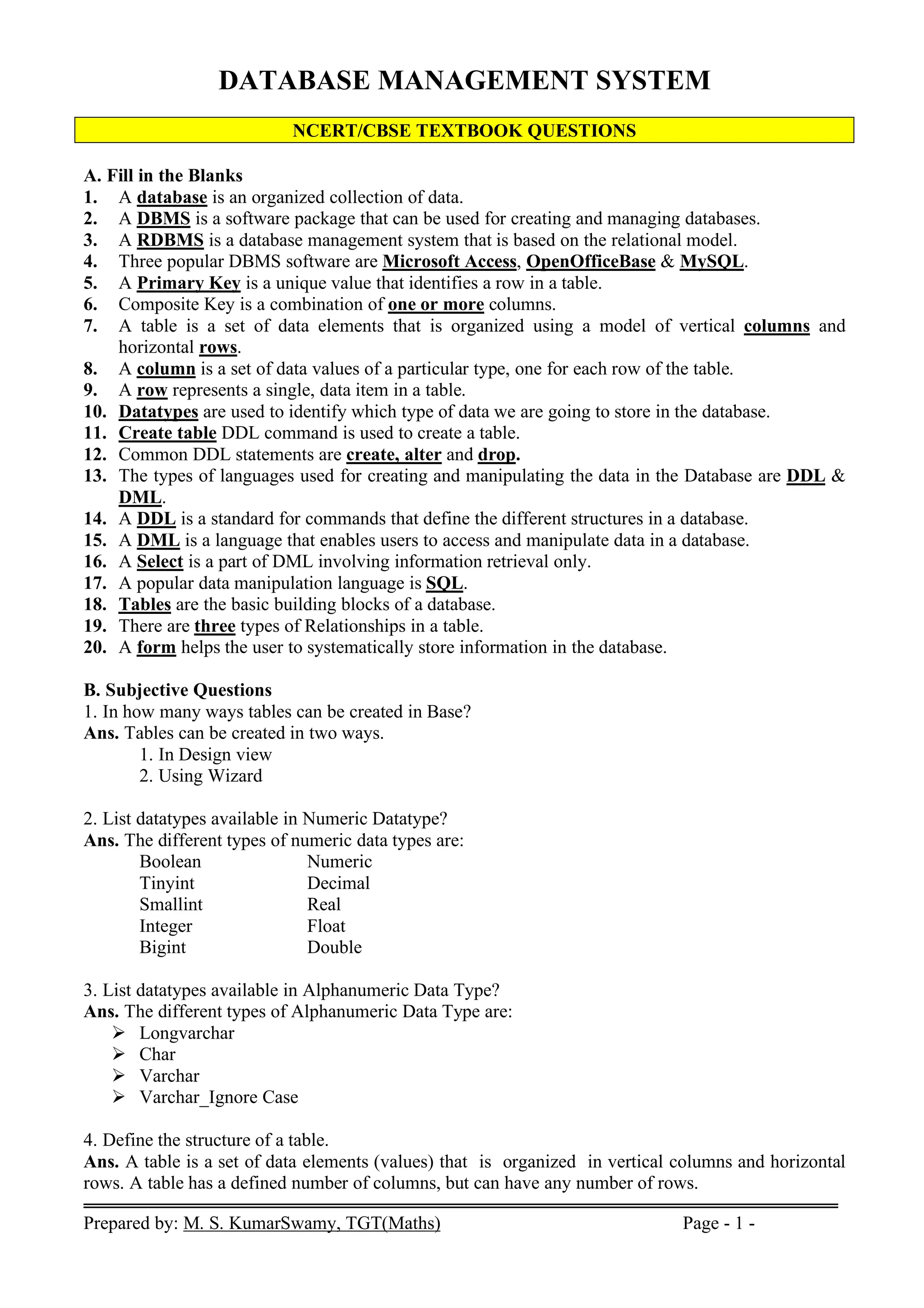 The document outlines essential concepts of database management systems (DBMS), including definitions, types of databases, and key terms such as primary keys, data types, and data manipulation languages. It includes both objective and subjective questions aimed at assessing understanding of DBMS fundamentals. Additionally, the document provides insights into creating and managing tables, relationships between data, and common SQL commands.