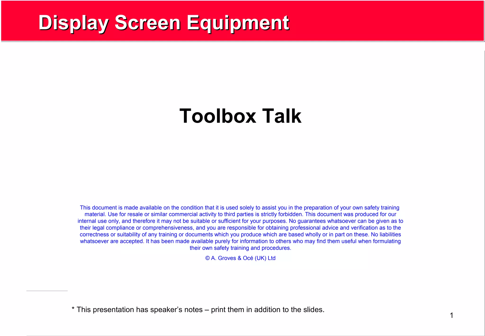 This document provides guidelines for proper ergonomics when working at a display screen. Key recommendations include adjusting the chair so the back is supported and arms are horizontal, positioning the screen at arm's length and below eye level, and taking short breaks to exercise every hour. Proper posture and lighting are also emphasized to avoid pain and injuries from prolonged screen use.