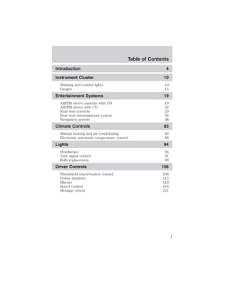 This document is a table of contents for an owner's manual that covers various vehicle systems and components. The table of contents lists sections on instrument clusters, entertainment systems, climate controls, lights, driver controls, safety restraints, driving instructions, roadside emergencies, customer assistance, maintenance, and specifications. It also includes brief introductions to warnings, congratulations on the new vehicle, breaking-in procedures, special notices, and warning symbol glossaries.