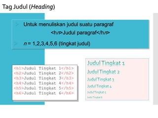 Dokumen ini menjelaskan cara memformat halaman web menggunakan HTML, termasuk penggunaan tag untuk judul, paragraf, dan format teks seperti tebal dan miring. Selain itu, dijelaskan juga tentang pengaturan warna latar belakang dan teks, serta contoh kode HTML yang dapat digunakan untuk membuat homepage sederhana. Penggunaan tag dan atribut yang tepat sangat penting untuk meningkatkan tampilan dan fungsionalitas halaman web.