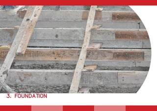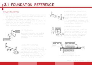 This document discusses different types of foundations, including shallow and deep foundations. Shallow foundations include pad, combined, cantilever, strip, and balanced base foundations, which are placed directly below structures and transfer loads to soil. Deep foundations extend below unsuitable soil using piles, which can be displacement piles driven into the ground or bored piles excavated with a lining. Pile caps are concrete structures that connect groups of piles and provide stability and load distribution.