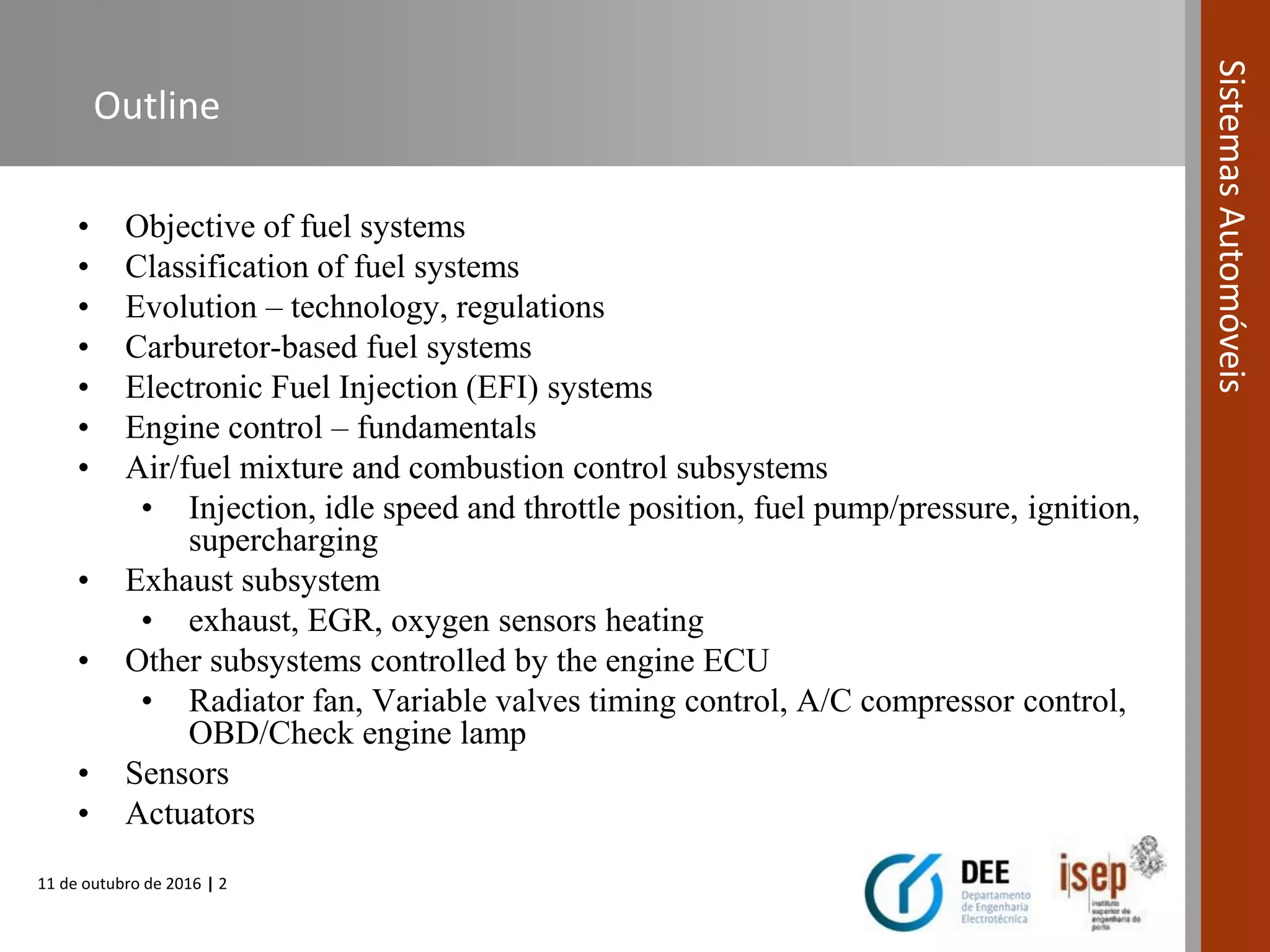 The document covers various fuel systems used in internal combustion engines, including carburetor-based and electronic fuel injection (EFI) systems. It discusses the evolution of fuel injection technologies, their classifications, and engine control fundamentals. The primary objectives outlined include optimizing fuel delivery for performance, emissions reduction, and adaptability to engine conditions.