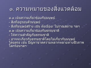 āđ . āļāļĢāļąāļāļāļēāļŠāļīāđāļāđāļ§āļāļĨāđāļāļĄāđāļĨāļ°āļāļ§āļēāļĄāļĒāļļāļāļīāļāļĢāļĢāļĄāļāļēāļāļŠāļīāđāļāđāļ§āļāļĨāđāļāļĄ (Environmental Justice) ( āļāļīāļāļēāļĢāļāļē Parameter āļāļēāļāļŠāļīāđāļāđāļ§āļāļĨāđāļāļĄ ) āđ . āđ Ecocentric Approach- Environmentalism/Ecologism âSpecies Justice, Climate Justice/Atmospheric Justice āđ . āđ Anthropocentric Approach- ( āļāļāļāļēāļ§ / āļāļāļāļģ , āļāļāļāļ / āļāļāļĢāļ§āļĒ , āļāļĢāļąāđāļ / āđāļāļĒ , āļāļāļĢāļļāđāļāļāļĩāđ / āļāļāļĢāļļāđāļāļŦāļāđāļē )/ āļŦāļĨāļąāļāļāļēāļĢāļāļąāļāļāļēāđāļāļāļĒāļąāđāļāļĒāļ·āļ (Sustainable development) - 6.