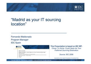 Madrid is a top location for IT sourcing due to its skilled workforce, competitive costs, and industry experience. IDC analyzed Madrid and found it has over 232,000 university graduates, many with engineering degrees. Madrid contributes 39% of Spain's IT market and over half of large company IT spending. Its workforce is experienced in key industries like telecom. Madrid offers the right skills at a competitive price while remaining culturally close to Europe.