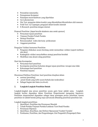 Dokumen ini membahas langkah-langkah dalam proses penelitian ilmiah yang mencakup identifikasi masalah, telaah pustaka, penyusunan hipotesis, pengumpulan dan analisis data, serta diseminasi hasil. Selain itu, dijelaskan tentang tujuan, batasan, dan strategi penelitian serta pentingnya validasi instrumen. Panduan untuk penelitian eksperimental juga diberikan dengan penekanan pada pentingnya pertanyaan kritis dalam setiap tahap penelitian.