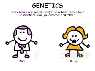 1) Genetics describes how traits are passed from parents to offspring through genes located on chromosomes. Genes contain DNA instructions that determine traits.
