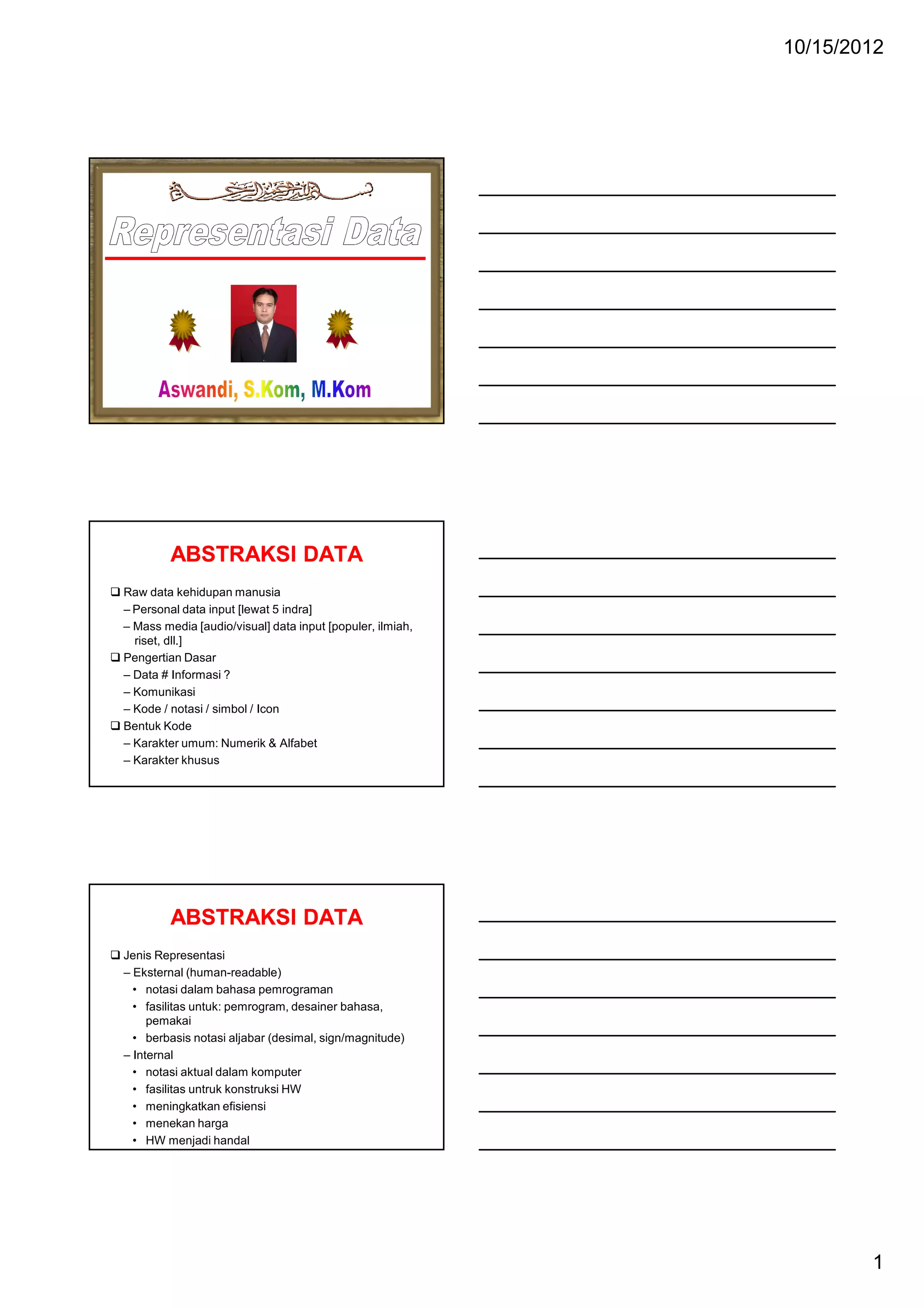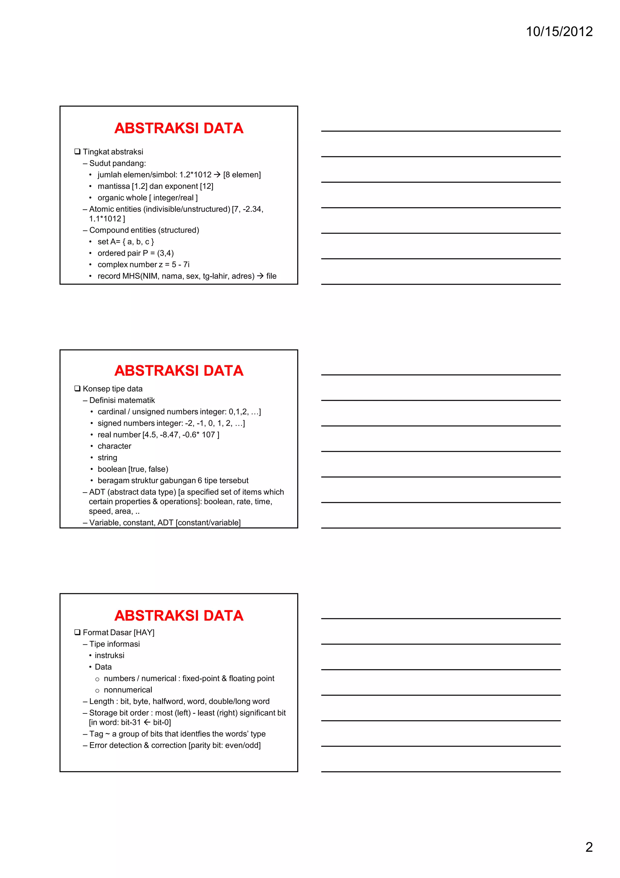 Dokumen tersebut membahas tentang abstraksi data dan sistem bilangan biner. Secara ringkas, dokumen tersebut menjelaskan tentang konsep dasar abstraksi data seperti data, informasi, dan kode representasi bilangan. Selanjutnya dibahas pula tentang jenis dan tingkat abstraksi data serta konsep tipe data matematika dan ADT. Terakhir dibahas format dasar penyimpanan bilangan di komputer beserta sistem bilangan biner seperti pengertian, representasi, not