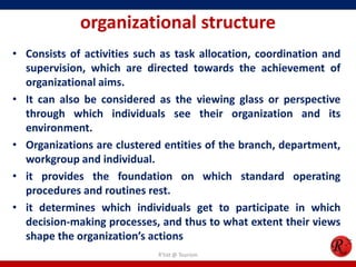 Organizational structure consists of how tasks are allocated, coordinated, and supervised to achieve organizational goals. It provides the foundation for standard operating procedures. There are several types of organizational structures including functional, divisional, matrix, flat, and hierarchical. Organizational development aims to increase an organization's relevance and viability through planned change efforts using behavioral science and is focused on understanding and managing organizational change. The core values of organizational development include providing opportunities for people and organizations to develop their full potential and function as human beings.