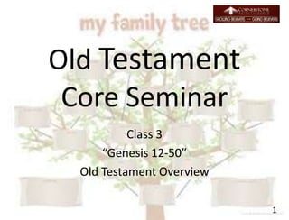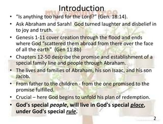 The document outlines the narrative of Genesis chapters 12-50, focusing on the lives of Abraham, Isaac, and Jacob as part of God's unfolding plan of redemption. It discusses God's promises to Abraham, including land, nationhood, and blessings, and how these promises continue through Isaac and Jacob, culminating in Joseph's rise and his role in saving many lives. Ultimately, it emphasizes God's sovereignty, grace, and the foreshadowing of the Savior's lineage through these generations.