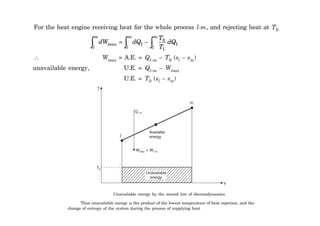 This document discusses availability and irreversibility in transient and steady flow systems. It provides definitions for available energy, unavailable energy, dead state, and effectiveness. It examines availability in terms of the first and second laws of thermodynamics. Equations are given for calculating maximum work, availability, and irreversibility for various thermodynamic processes involving changes in temperature, pressure, and volume. Two sample problems are included and solved to demonstrate calculating work, availability change, and irreversibility for specified thermodynamic systems.